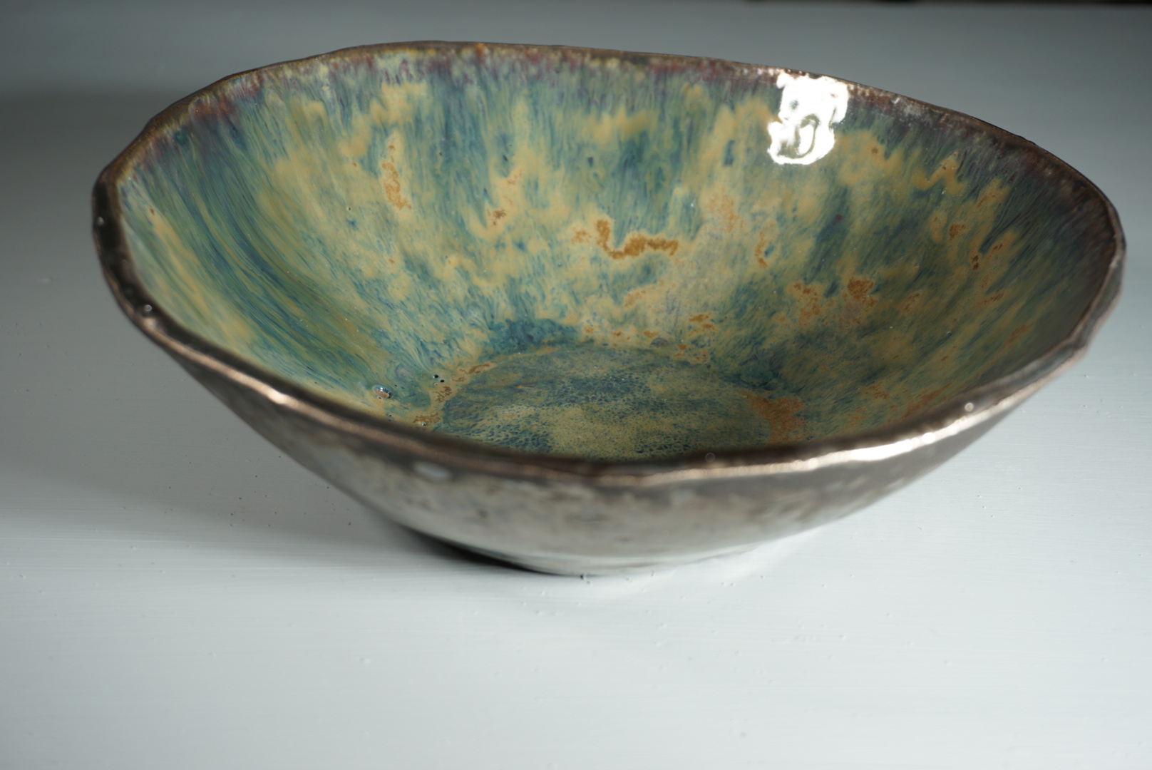 White clay bowl with merging green and yellow glaze and super high polished dark copper exterior